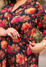 Plus Size Black Floral Pure Chinon Wrap Co-ord Set